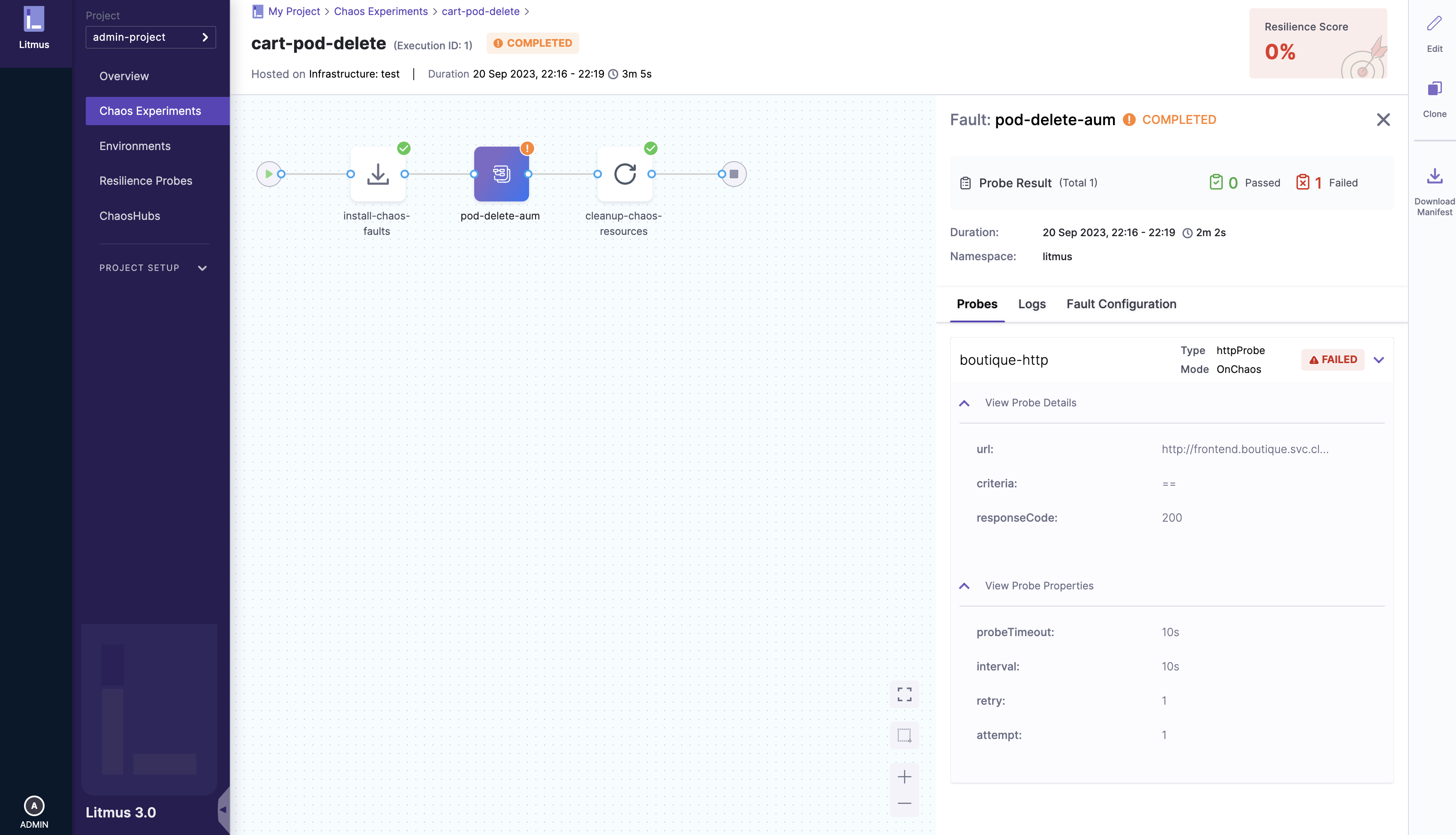 If the user chooses to Save and Run the experiment, they will be redirected directly to the experiment execution page where the experiment execution steps will be visualized, else they will be taken Chaos Experiment Page.